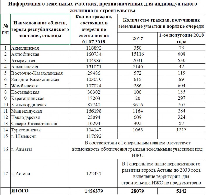 Больше всего заявлений на предоставление участков подали жители Мангистауской области - в очереди числится 166 198 жителей региона. При этом в 2017 году там было выдано 1 164 участка, а в первом полугодии 2018 года 10 соток земли получили 284 жителя. Также среди регионов-лидеров по количеству очередников на землю под ИЖС значатся: Актюбинская, Алматинская, Туркестанская, Акмолинская, Атырауская, Жамбылская области и город Шымкент.