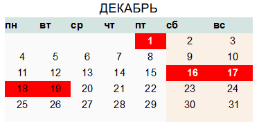 при пятидневной рабочей неделе: 16, 17, 18, 19  декабря - выходные дни;