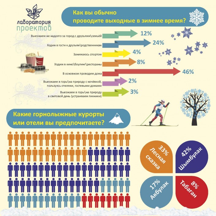 Отвечая на вопрос, как казахстанцы обычно проводят выходные в зимнее время, 46 процентов респондентов отметили, что на выходных они остаются дома, 24 процента навещают своих друзей и родственников. Стоит заметить, что только 2 процента опрошенных выезжают на природу с ночевкой, пользуясь отелями и гостевыми домами.