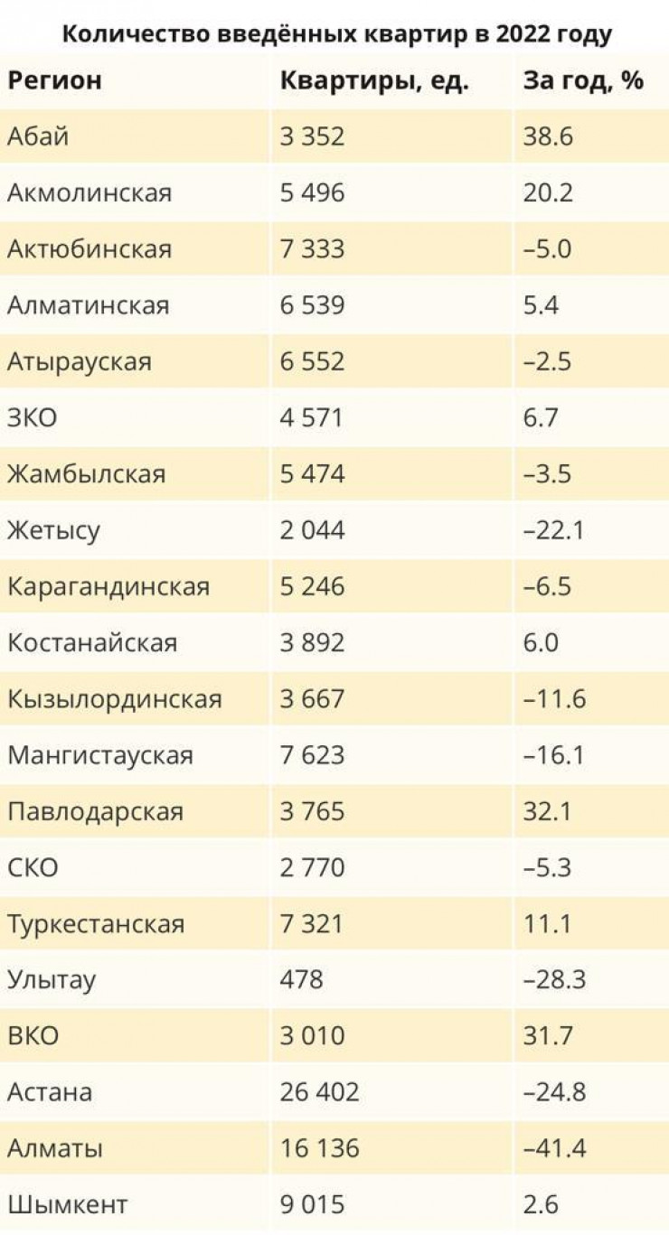 Максимальное уменьшение отмечено в Алматы: -41,4 процента. В то же время по количеству введенных квартир за год город находится на втором месте после Астаны (-24,8 процента).