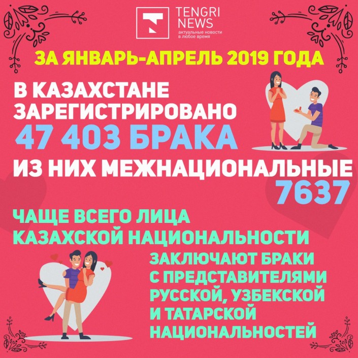 Сообщается, что за январь-апрель 2019 года в стране зарегистрировано 47 403 брака, из них 7 637 браков, или 16,1 процента, заключены между представителями разных национальностей.