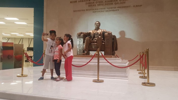 Посетители делают фотографии на фоне скульптуры Президента.