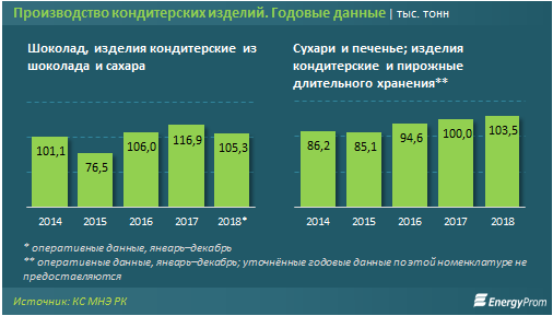 За I квартал казахстанские кондитеры произвели 21,5 тысячи тонн кондитерских изделий из шоколада - на 9,8 процента меньше, чем годом ранее. Производство мучных кондитерских изделий длительного хранения также сократилось: на 2,3 процента за год, до 25,4 тысячи тонн.