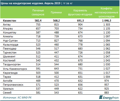 Цены на пряники выросли на 1,2 процента за месяц и на 7,2 процента - за год, до 568,2 тенге за килограмм. Дороже всего пряники обходятся жителям столицы (827 тенге за килограмм), Актау (815 тенге за килограмм) и Алматы (739 тенге за килограмм) - той же тройки самых "дорогих" городов для казахстанских любителей сладкого.