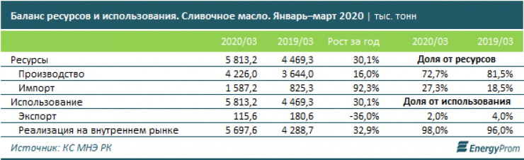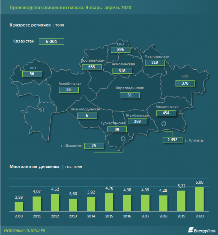 Сообщается, что за четыре месяца в Казахстане произвели шесть тысяч тонн сливочного масла, это на 15 процентов больше, чем год назад. Почти три четверти выпуска (74,9 процента) сосредоточено в четырех ключевых регионах - Алматы и прилегающей области, а также в Северо-Казахстанской и Костанайской областях.