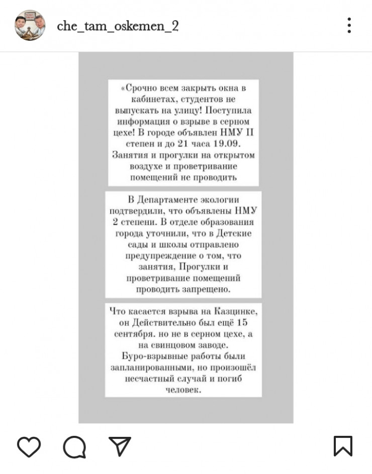 С утра в сети распространяется информация о том, что произошла авария в серно-кислотном цехе на производстве "Казцинка". Жителям Усть-Каменогорска, известного своей крайне неблагоприятной экологической обстановкой, настоятельно рекомендовали закрыть форточки и окна, не выходить на улицу.