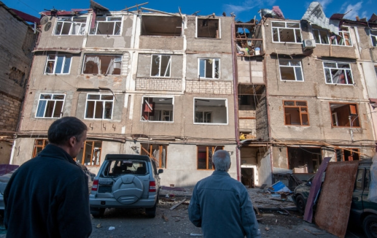 Жилой многоквартирный дом, пострадавший в результате ночного обстрела Степанакерта в Нагорном Карабахе. Фото РИА Новости