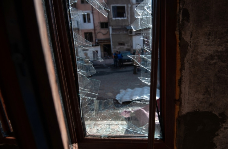 Окно с выбитыми стеклами в одной из квартир жилого дома, пострадавшего в результате ночного обстрела Степанакерта в Нагорном Карабахе. Фото РИА Новости