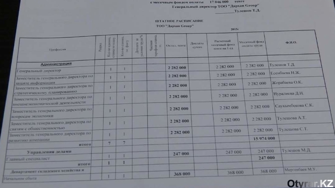 "Все они занимали эти должности формально. Никогда на работу не приходили, заработная плата их составляла по 2 миллиона 282 тысячи тенге в месяц. В то время, когда у нас были такие зарплаты у руководящих, простые рабочие получали по 25-28 тысяч тенге", - добавила начальник Отдела по управлению кадровыми и трудовыми отношениями.