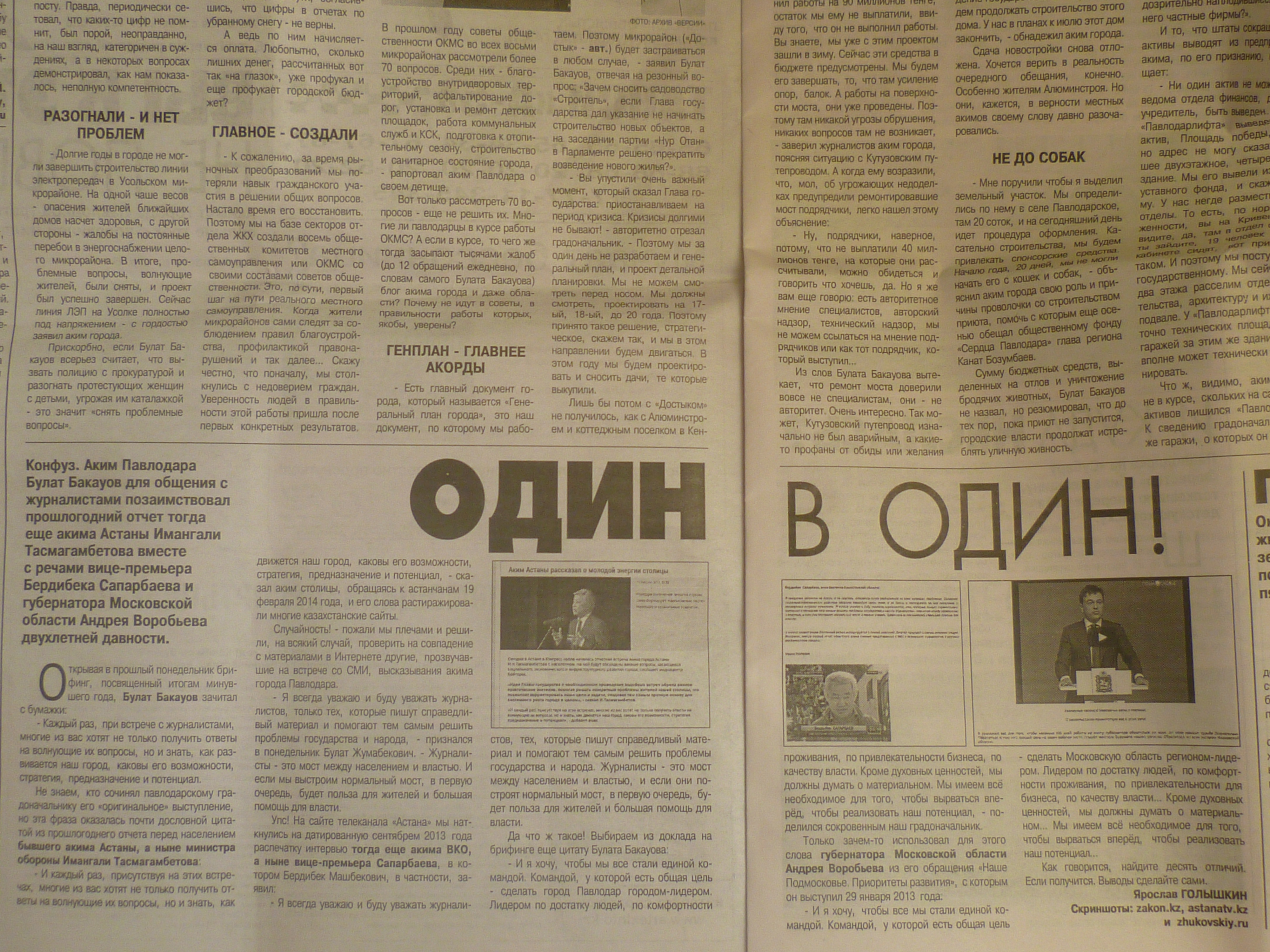 Павлодарская газета "Версия" сообщила о том, что аким Павлодара Булат Бакауов в своем отчете перед СМИ использовал выступления акима Астаны Имангали Тасмагамбетова, вице-премьера Бердибека Сапарбаева и губернатора Московской области Андрея Воробьева двухлетней давности.