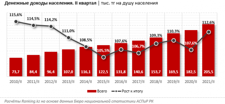 Аналитики сравнивают, что годом ранее доходы казахстанцев составляли 182,5 тысячи тенге, плюс 7,6 процента за год. Доходы, использованные на потребление, составляли 171,3 тысячи тенге - всего на 4,7 процента выше, чем годом ранее (при инфляции в 6,8 процента).