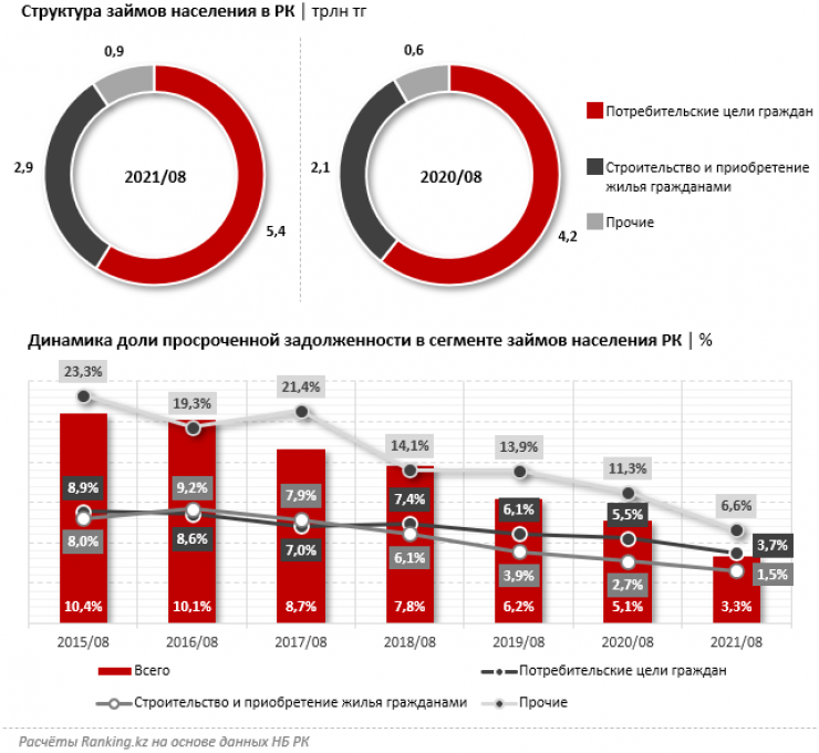 Данные БНС подтверждаются и аналитикой регулятора, Нацбанка. При рассмотрении структуры займов населения можно отметить, что в этом году доля потребительских кредитов в них составила 58,9 процента (против 60,6 процента годом ранее), кредитов на строительство и приобретение жилья гражданами, то есть ипотечных займов - 31,8 процента (против 31 процента годом ранее), прочих розничных кредитов - 9,4 процента (против 8,4 процента год назад).