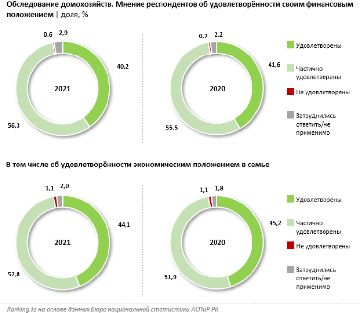В агентстве заявили, ссылаясь на результаты обследования домохозяйств Бюро национальной статистики, 40,2 процента казахстанцев в этом году, несмотря на длящийся "коронакризис", полностью удовлетворены своим финансовым положением. По их данным, еще 56,3 процента жителей удовлетворены частично. Не удовлетворены финансовой ситуацией 0,6 процента респондентов, и еще 2,9 процента затруднились с ответом.