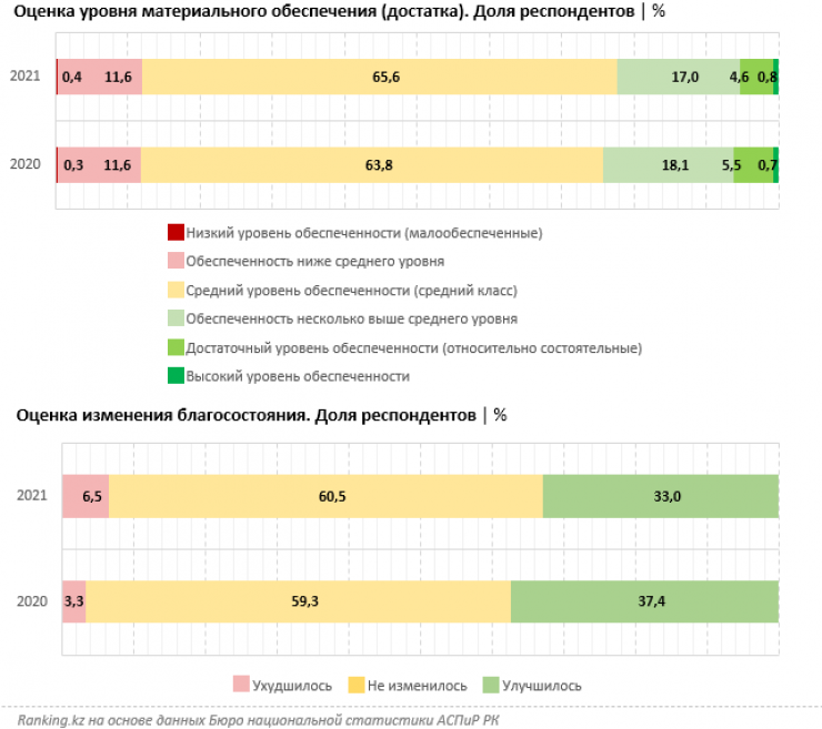 По данным опроса касательно восприятия казахстанцами своего уровня материального обеспечения, 88 процентов респондентов оценили его от среднего и выше. Относительно состоятельными себя считают 4,6 процента жителей, весьма состоятельными - всего 0,8 процента. Непосредственно средний класс составляет две трети респондентов. А вот малообеспеченными назвали себя лишь 0,4 процента жителей.