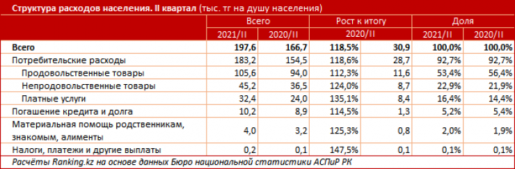 Аналитики также заявили, что почти 93 процента от расходов составили потребительские расходы - 183,2 тысячи тенге на душу населения в квартал, плюс 18,6 процента за год. Из них 105,6 тысячи тенге ушло на продовольственные товары, 45,2 тысячи тенге - на непродовольственные и 32,4 тысячи тенге - на платные услуги.