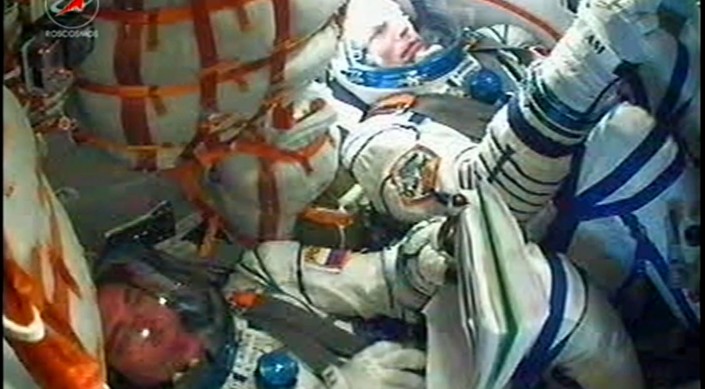 Космонавты Сергей Волков и Андреас Могенсен  после старта. Кадр из трансляции "Роскосмоса"