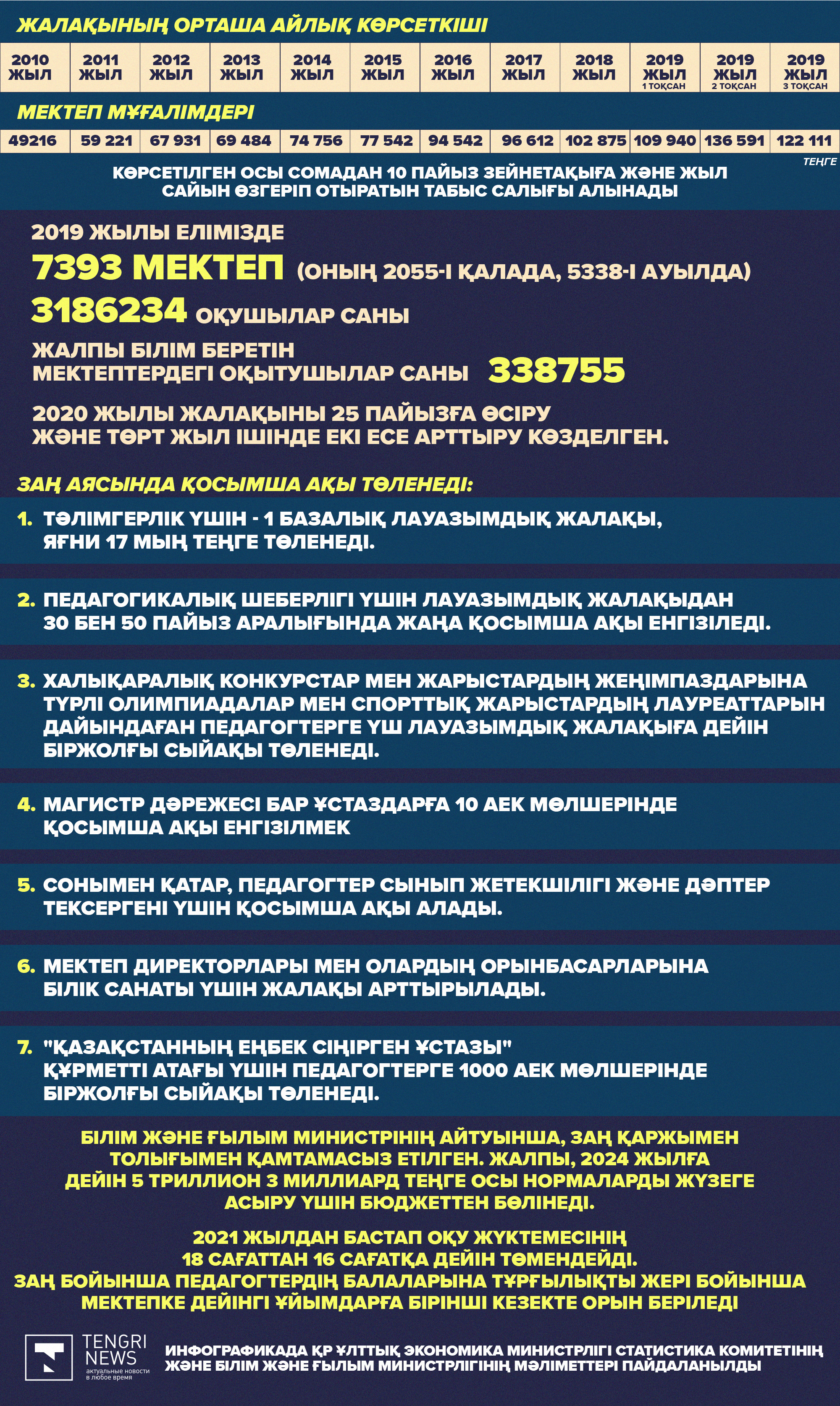 Ұлттық экономика министрлігі Статистика комитетінің мәліметінше, мұғалімдердің жалақысы 10 жыл бұрын 49 216 мың теңге болған. Былтыр бұл көрсеткіш 122 111 мың теңгеге тең болған. Алайда бұл сомадан зейнетақыға 10 пайыз және жыл сайын өзгеріп отырған табыс салығын алып тастау керек.