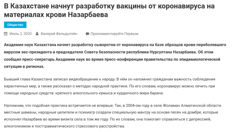 Сообщение о разработке вакцины из плазмы Назарбаева назвали фейком