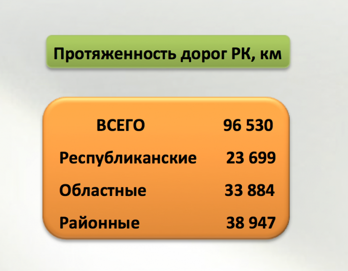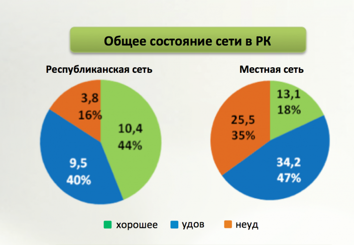 Как рассказал сотрудник Комитета автомобильных дорог МИР РК Максат Баяхмет, по состоянию на начало 2016 года из 23 699 километров республиканской сети 44 процента находится в хорошем состоянии, 40 процентов – в удовлетворительном, а 16 процентов в неудовлетворительном. По оценкам Комитета автодорог, 47 процентов (34,2 тысячи километров) местной сети (дороги областного и районного значения) находится в удовлетворительном состоянии, 35 процентов в неудовлетворительном, а 18 процентов в хорошем состоянии.