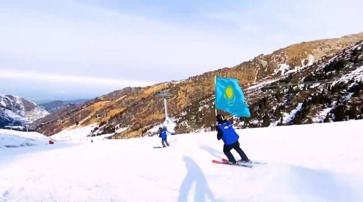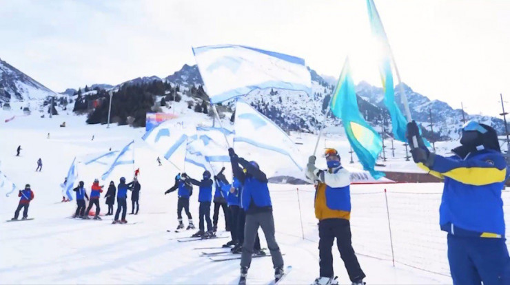 С флагами Казахстана члены партии "Ак жол" поднялись на Шымбулак и эффектно спустились вниз.