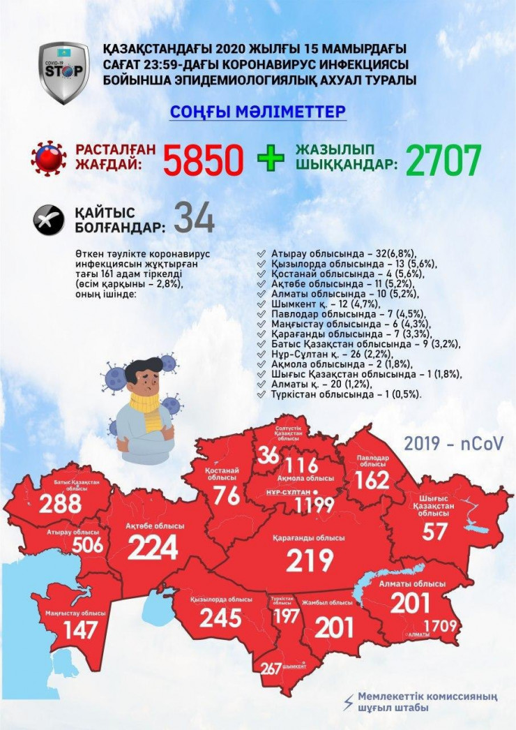 Сразу 161 случай коронавируса выявлен в Казахстане, передает Tengrinews.kz со ссылкой на оперативный штаб Госкомиссии.