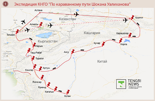 Маршрут группы географов, биологов и языковедов проходит через города Великого Шелкового пути, по которому 155 лет назад Шокан Уалиханов совершил путешествие в Кашгарию (Китай). За 12 дней участники экспедиции на автомобилях преодолеют шесть тысяч километров по территории КНР и Кыргызстана: Урумчи - Карашахар - Корла - Кучар - Аксу - Кашгар - Артуш - Янгисар - Яркенд - Кагалык - Хотан - Кашгар - Турагат - Нарын -Таш-Рабат - Бишкек.