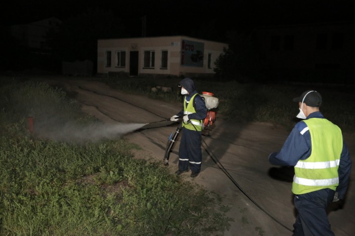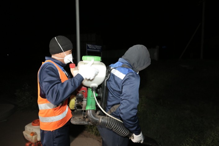 Обработка территории города ведется силами четырех районных акиматов. Работы ведутся с апреля до конца сентября и охватывают шесть туров. В данный момент завершается 3-й тур, следующий этап обработки открытых станций и водоемов начнется в 20-х числах июля.