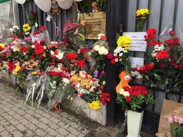 Алматинцы возлагали цветы, игрушки и свечи у забора консульства. В самом здании были размещены несколько книг соболезнований, куда каждый желающий мог написать свои слова поддержки. Генеральный консул России в Алматы Алексей Демин отметил, что митинг скорби состоялся благодаря алматинской общественности, в частности блогерам и активистам в социальных сетях.