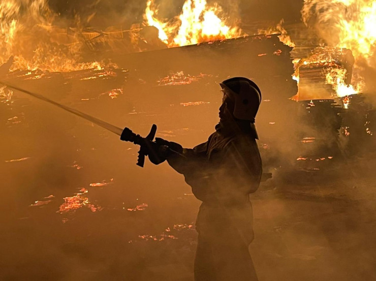 Из-за высокого теплового излучения создалась угроза распространения огня на соседние штабеля с древесиной и строящееся здание.