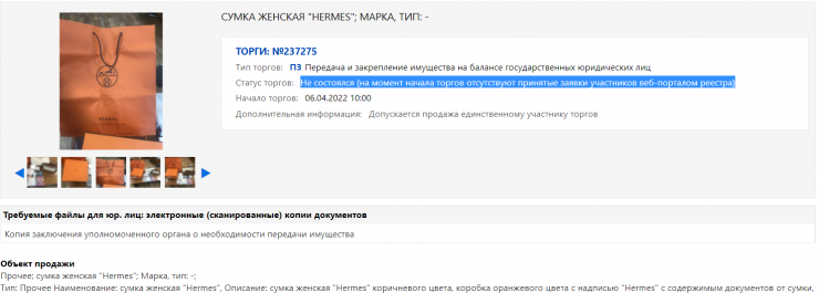 Отметим, что в прилагаемом к лоту отчете об оценке прикреплен файл с названием "Подарки". Не исключено, что брендовая сумка оказалась на балансе Департамента государственного имущества либо в качестве конфиската, либо в качестве добровольно сданного подарка.