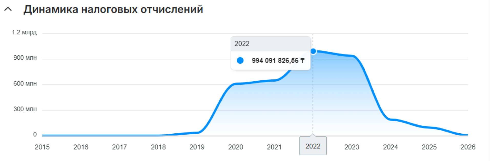 Налоговые отчисления компании за последние годы резко упали: если в 2022-2023 годах она платила почти по миллиарду тенге в казну (994 миллиона тенге в 2022 году и 939 миллионов тенге в 2023-м), то в 2025-м – лишь 95 миллионов, а за первые месяцы 2026 года – и вовсе 4,4 миллиона.