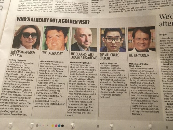 Они рассказали работавшему под прикрытием журналисту The Sunday Times, что помогли получить "золотую визу" члену семьи Муамара Каддафи, сыну коррумпированного министра тайского правительства, обвиненному во взятках египтянину, а также гражданину Эритреи, который, возможно, участвовал в сделках с военными Анголы.