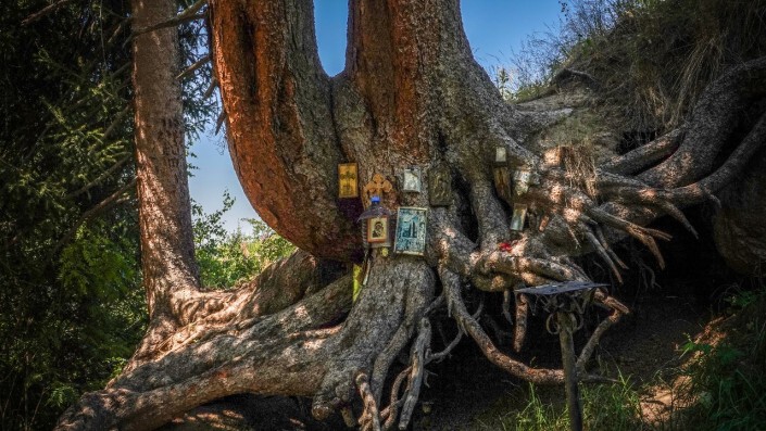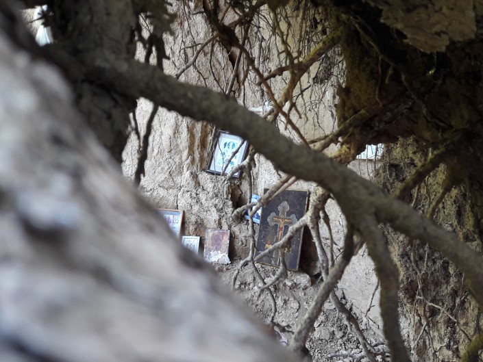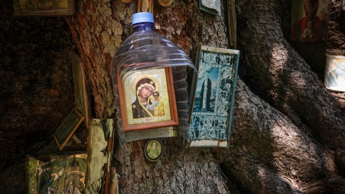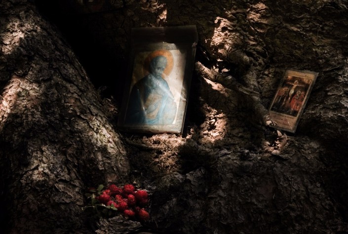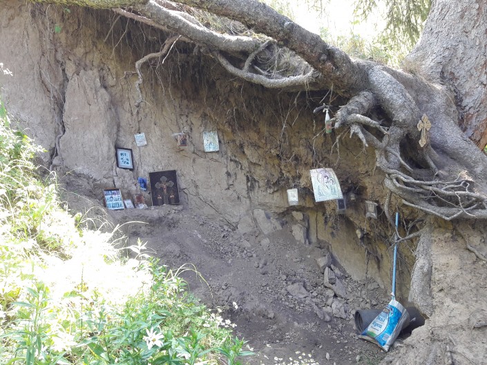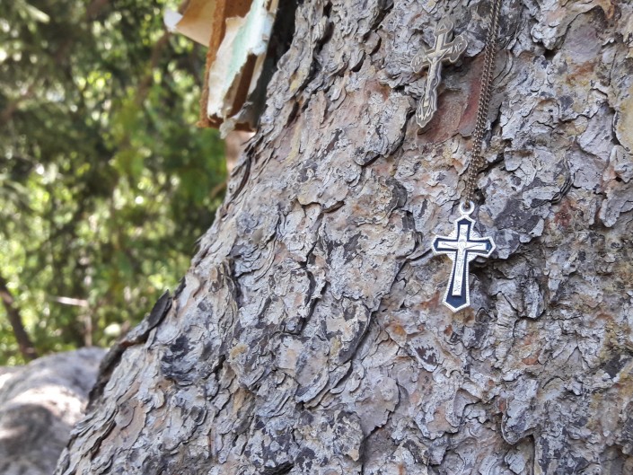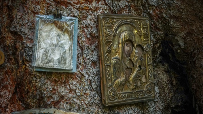 В глаза бросается множество самых разных икон и крестов. Они размещены в небольших углублениях под корнями елей и на стволах деревьев. Некоторые иконы завернуты в целлофановые пакетики для защиты от дождя и ветра.