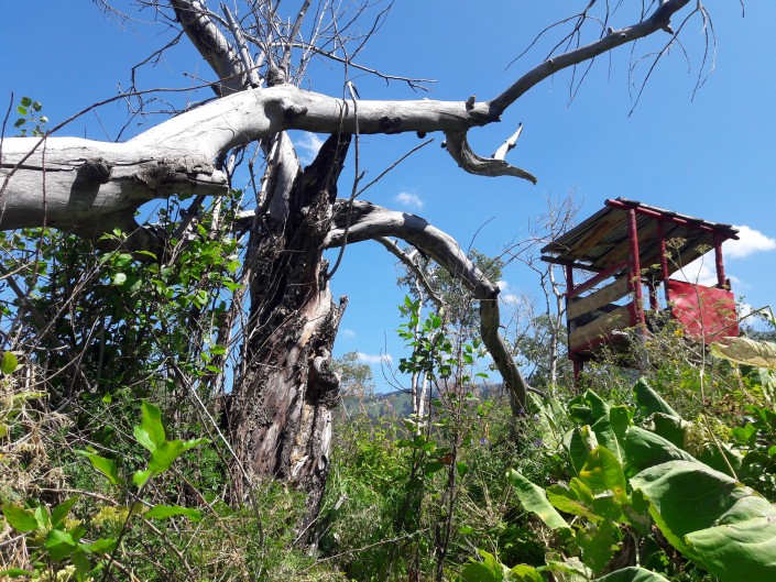 Недалеко от скита находится обзорная площадка. Облупившаяся и начавшая облезать яркая краска, покосившаяся лесенка, огромный выбеленный солнцем и ветрами ствол и едва проходимые заросли кустарника. Похоже, что этим строением давно не пользуются.
