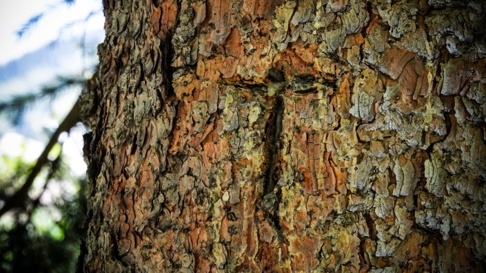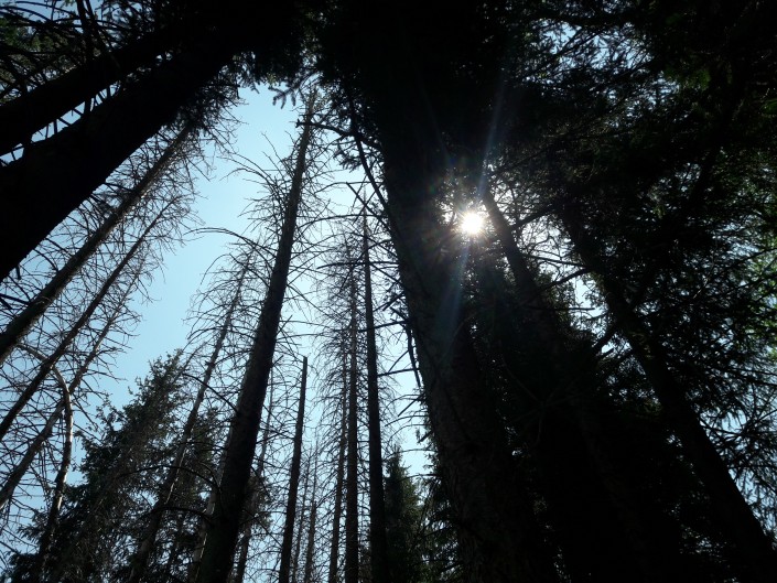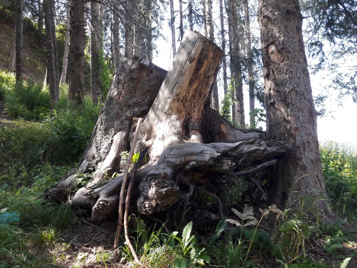 На пути попадаются старые высохшие деревья и пеньки. Возле одного из них прислонены несколько очищенных от коры веток, которые, по всей видимости, служат паломникам и туристам посохами и помогают при подъеме в горы.