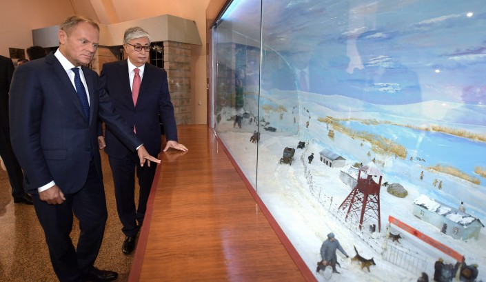 Президент Казахстана и глава Евросовета возложили венки к памятным плитам мемориала "АЛЖИР" и осмотрели музейную экспозицию, рассказывающую о судьбе репрессированных.