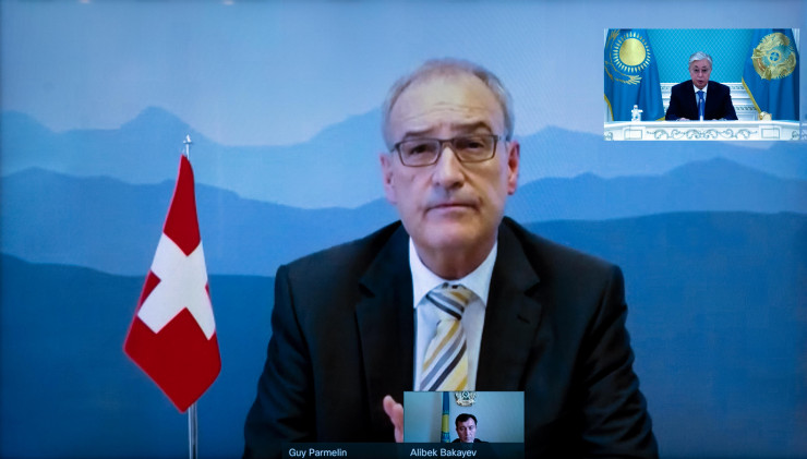 Президент Казахстана Касым-Жомарт Токаев в режиме видеоконференцсвязи провел переговоры с президентом Швейцарии Ги Пармеланом, передает Tengrinews.kz со ссылкой на сайт Акорды.