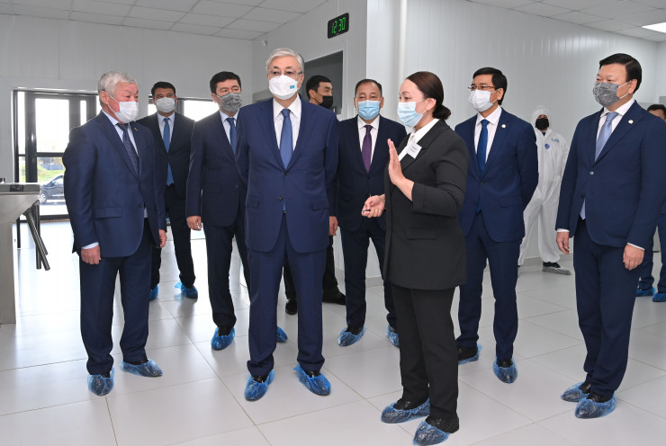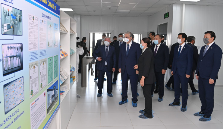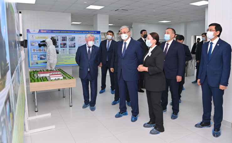 Биофармацевтический завод по производству вакцин QazVac при Научно-исследовательском институте проблем биологической безопасности расположен в поселке Гвардейском Кордайского района. Президенту показали технологическую линию производства вакцин, лабораторное оборудование и мобильные реакторы.