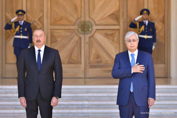 Церемония встречи прошла в торжественной обстановке. Алиев встретил Токаева у автомобиля.