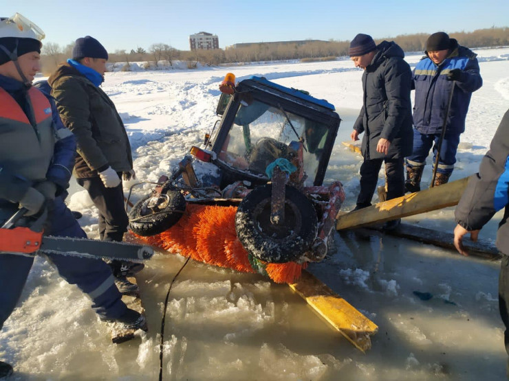 Трактор провалился под лед в парке Караганды