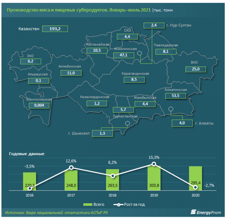 По данным статистики, с января по июль 2021 года в Казахстане произвели 193,2 тысячи тонн мясной продукции, то есть на 4,3 процента больше, чем за год до этого. Больше всего мяса произвели в Алматинской области - 53,5 тысячи, Акмолинской - 47,1 тысячи тонн и Восточно-Казахстанской - 25 тысяч тонн.