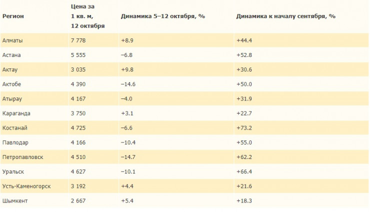 Отмечается, что в Алматы пока снижения не наблюдается, отчасти из-за изменения структуры рынка и дефицита дешевых квартир. На 12 октября город лидирует по абсолютному показателю цен на квартиры - 270 тысяч тенге за однокомнатную, 500 тысяч за двухкомнатную и 750 тысяч за трехкомнатную. На втором месте по ценам Астана - 250 тысяч тенге за однокомнатную, 350 тысяч за двухкомнатную и 500 тысяч за трехкомнатную.