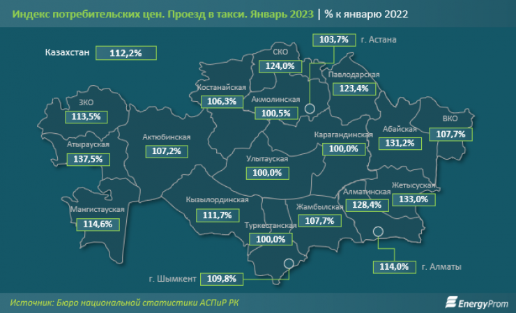 По данным статистики, на январь 2023 года цена такси за год в Казахстане выросла на 12,2 процента. Среди регионов самый большой рост цен произошел в Атырауской области (37,5 процента), а также Жетысуской и Абайской областях (более 30 процентов).