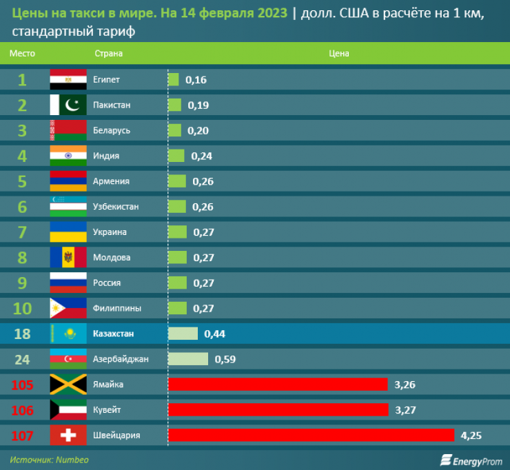 На 14 февраля 2023 года, согласно данным Numbeo, самые низкие цены на услуги такси в расчете на километр по стандартному тарифу были зафиксированы в Египте (0,16 доллара), Пакистане (0,19 доллара) и Беларуси (0,2 доллара). Для сравнения: в Казахстане цена составила 0,44 доллара, что, к примеру, дороже, чем в Армении и Узбекистане (0,26 доллара), а также в Украине, Молдове и России - 0,27 доллара за километр. Дороже Казахстана по ценам на такси среди стран СНГ оказался лишь Азербайджан (0,59 доллара).