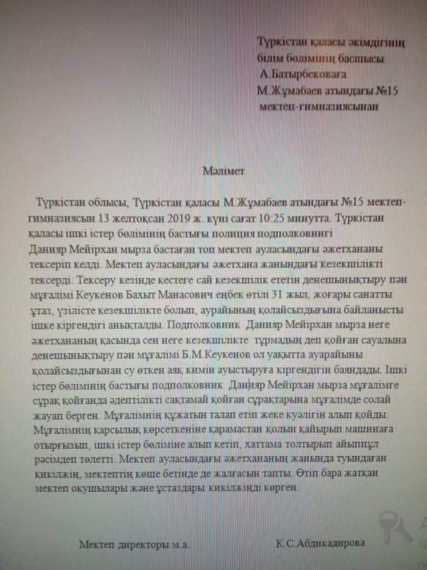 "Инцидент, имевший место в отношении учителя школы №15 города Туркестан, совершенно недопустим. Со стороны МОН РК будут приняты все необходимые меры по защите данного учителя.