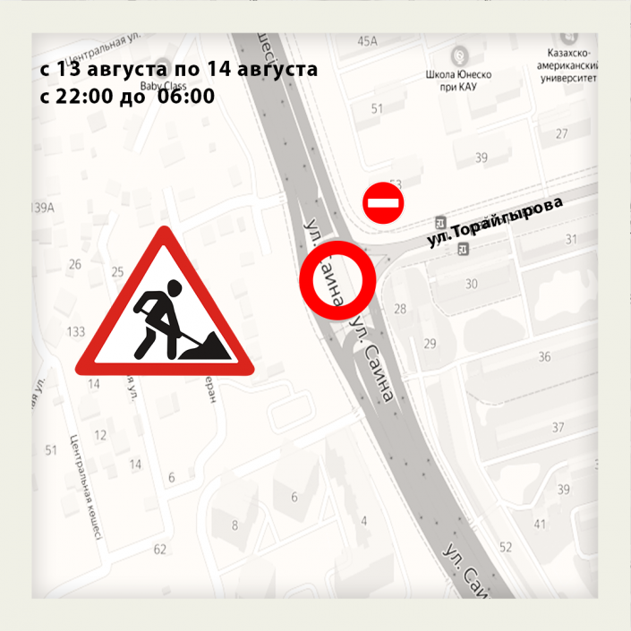 Движение ограничат по улице Торайгырова (участок транспортной развязки улицы Саина и улицы Торайгырова) с 13 августа 22:00 по 14 августа 6:00 утра.