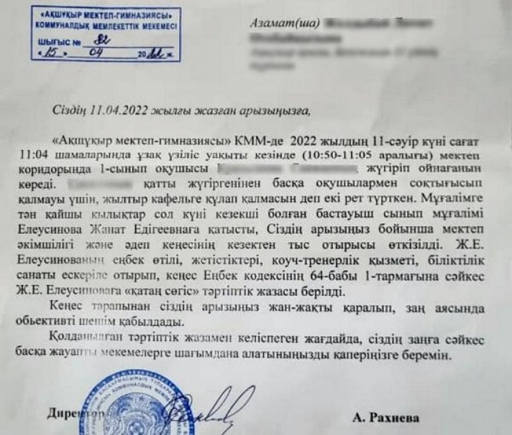 Директор гимназии указала в ответном письме, что учитель параллельного класса не ударила девочку, а придержала ее, чтобы та при беге не упала.