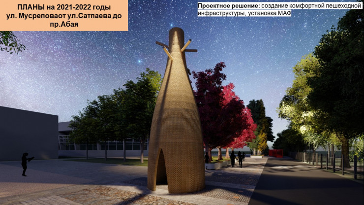 Акимат планирует создать зеленые зоны с высаженными деревьями разных сортов. По проекту в начале улицы со стороны Сатпаева будет небольшой фонтан, воды которого будут течь по небольшим углублениям прямо по дороге, создавая прохладу и комфорт.