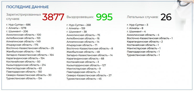 С утра 3 мая в Казахстане было зарегистрировано 20 новых случаев заражения коронавирусной инфекцией. Всего в стране подтверждено 3877 случаев.