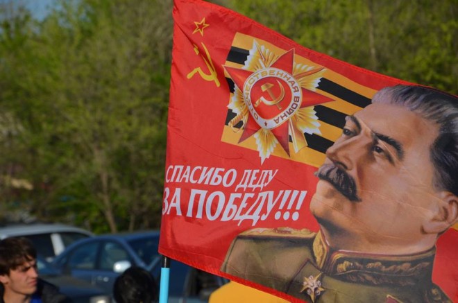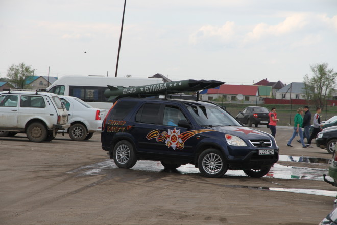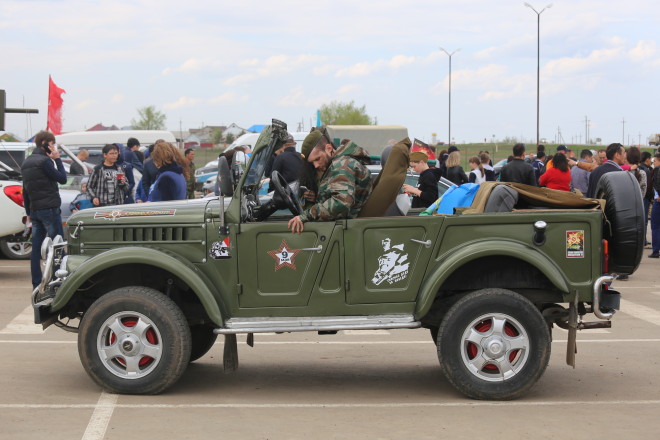 9 мая участники автопробега собрались на стоянке возле торгового центра "Дина". Все машины были разукрашены военной символикой и флагами СССР, на многих имелись надписи "Спасибо деду за победу", "На Берлин", "Помним и гордимся!", "За Сталина!", "Спасибо бабуле за меткие пули" и прочие. Водители были одеты в гимнастерки, пилотки военного времени.